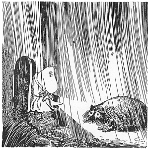 The gloomy Muskrat (Bisamråttan) is called a "would-be philosopher, likes to be left in peace." He first appears in Comet in Moominland. One night, Moominpappa hears a "plaintive noise" during a downpour. He finally goes to the front door with his flashlight (torch) and illuminates "something wet and miserable, with shiny black eyes." It is the Muskrat, who introduces himself as "a philosopher, you know" and complains that Moominpappa's bridge-building activities had ruined his home on the river bank. Moominpappa apologizes and lets Muskrat in. Muskrat declines a bed. Muskrat explains that as a philosopher, "I sit and think about how unnecessary everything is."