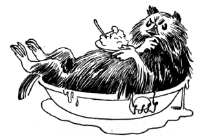 Later Moominmamma hushes little Moomintroll (their child) when she cries out that "There are hardly any unnecessary things," saying to her that "The Muskrat is a wise man who knows about everything, and why it is unnecessary." Muskrat predicts the arrival of a comet, and joins the family in a cave to which they have retreated for the comet's passing. After the comet's passing, they celebrate with a cake, first discovering that Muskrat has absentmindedly sat on it. He is irately obliged to sit in a tub of water to get clean.