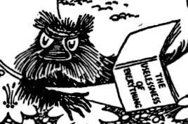 Unfortunately, Muskrat only appeared in these two books. But Jansson has achieved what better writers for children do. She created an entertaining children's narrative with an extra gift for literate adults. Clearly Muskrat is a satirical version of the philosopher Arthur Schopenhauer, the pessimist solitary philosopher whom the Muskrat even looks like, including the wild hair, bristly sideburns, and false teeth.